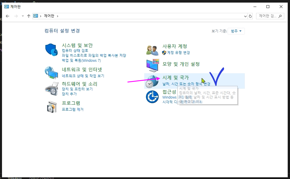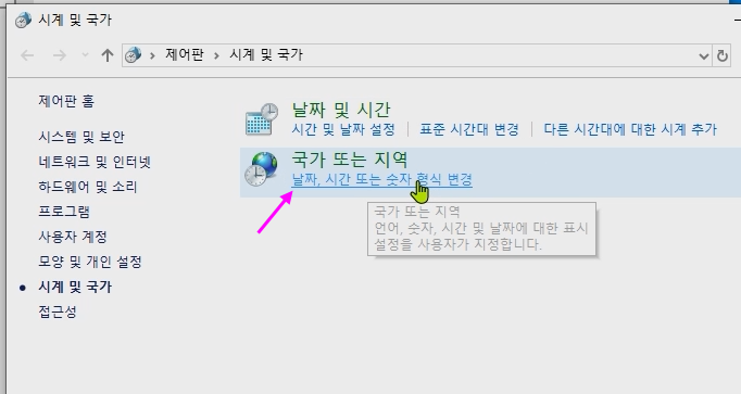 그리고, 아래처럼, 시계 및 국가를 클릭하세요.