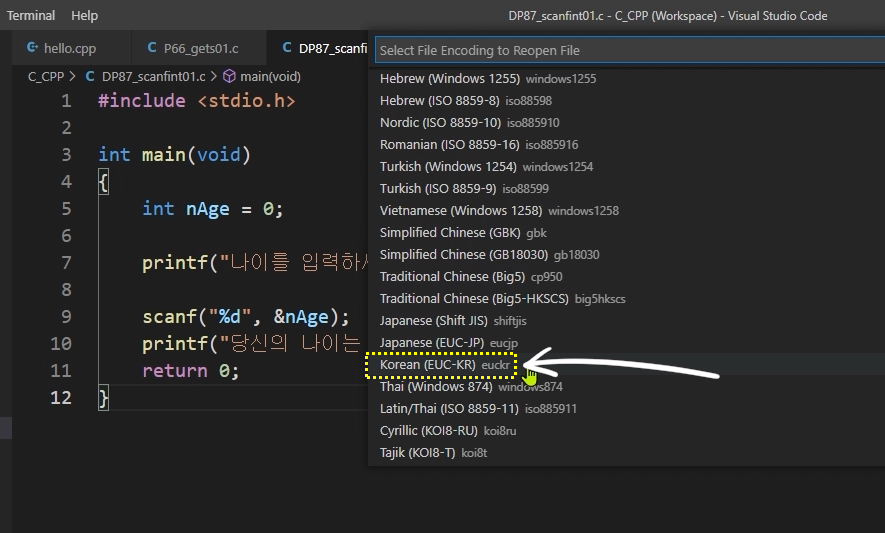 아래 이미지처럼, 한글이 포함된 코드를 작성하게 되면, 자동으로 언어를 감지하여, EUC-KR이 선택되도록 하여,