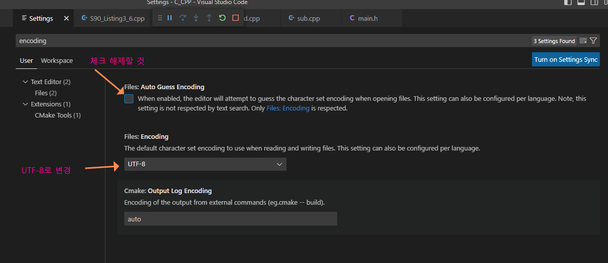 이어서 뜨는 설정 검색창에 검색창에 encoding 으로 검색합니다.