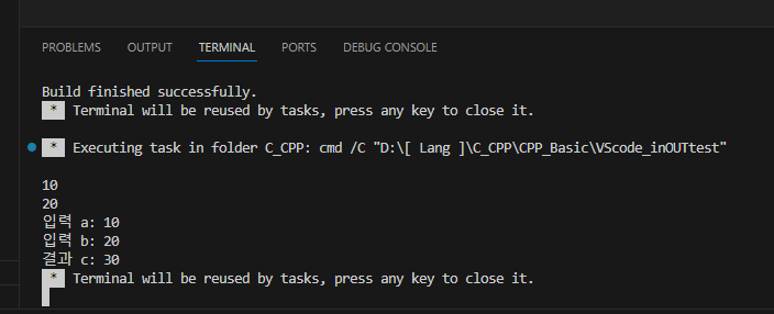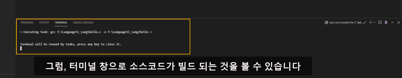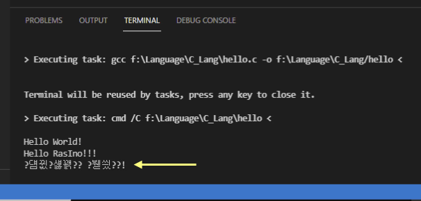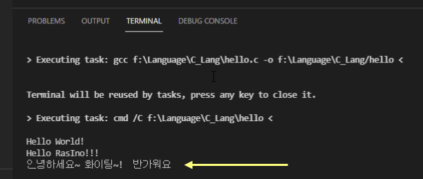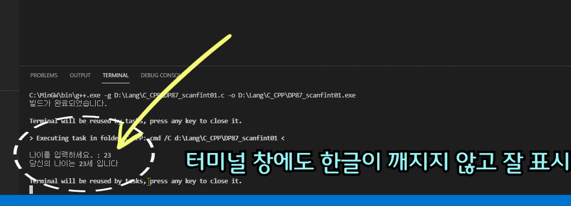 그리고 실행(Ctrl+R)시켜 보면, 터미널 창에도 한글이 깨지지 않고 잘 표시되는 것을 볼 수 있습니다.