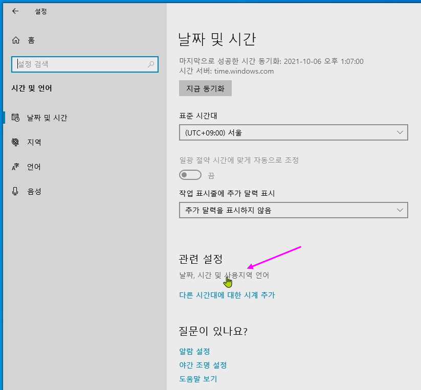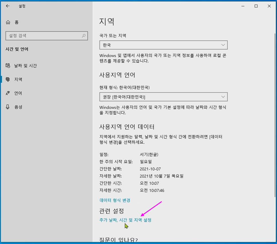 그리고 이어지는 창에서, 아래처럼, 추가 날짜, 시간 및 지역 설정 부분을 클릭하세요.