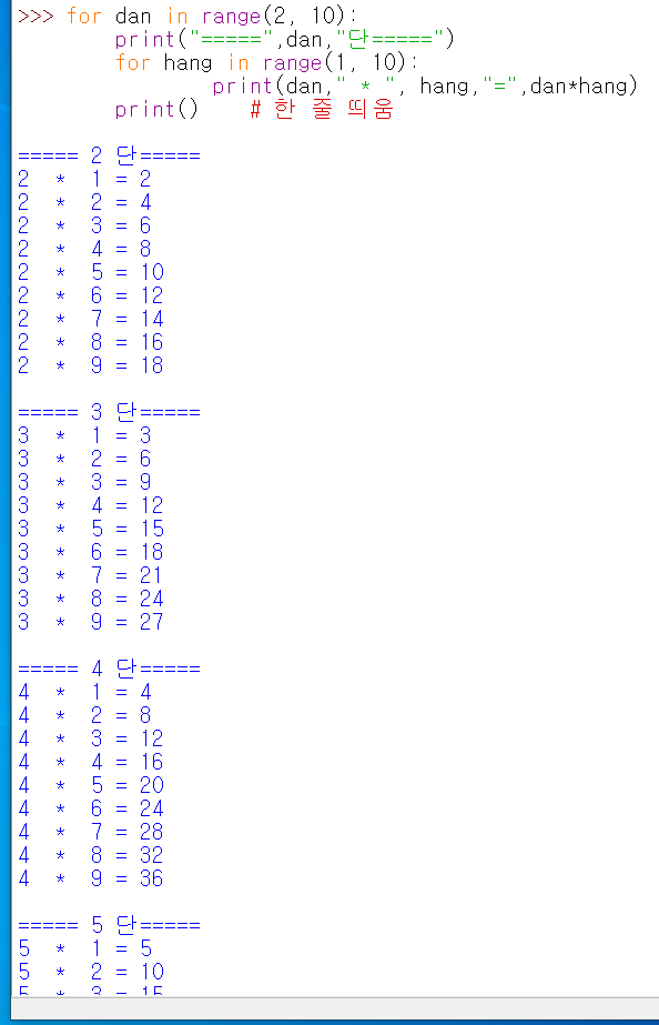 - 알고리즘에 문제가 없으면, '=== 2단 ===' , '줄 바꿈' 등 출력 결과를 꾸며주며 마무리 하세요.