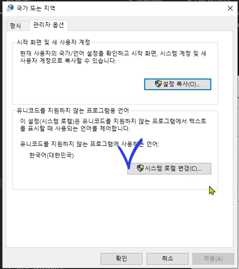 그리고, 시스템 로캘 변경(C)을 선택하세요.