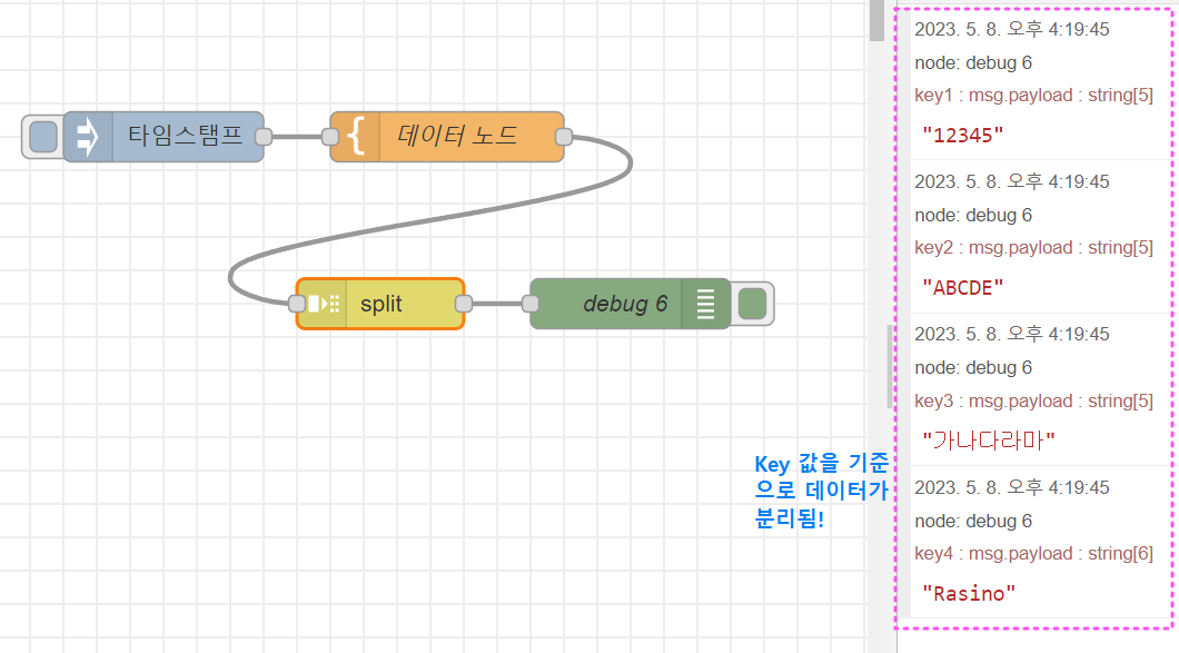이를 실행하면 아래처럼 Key값을 기준으로 데이터가 분리되어 출력되는 것을 확인할 수 있습니다.