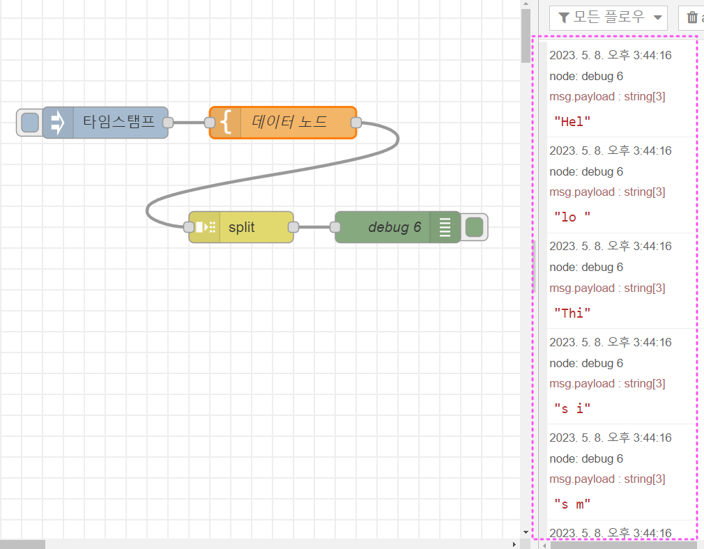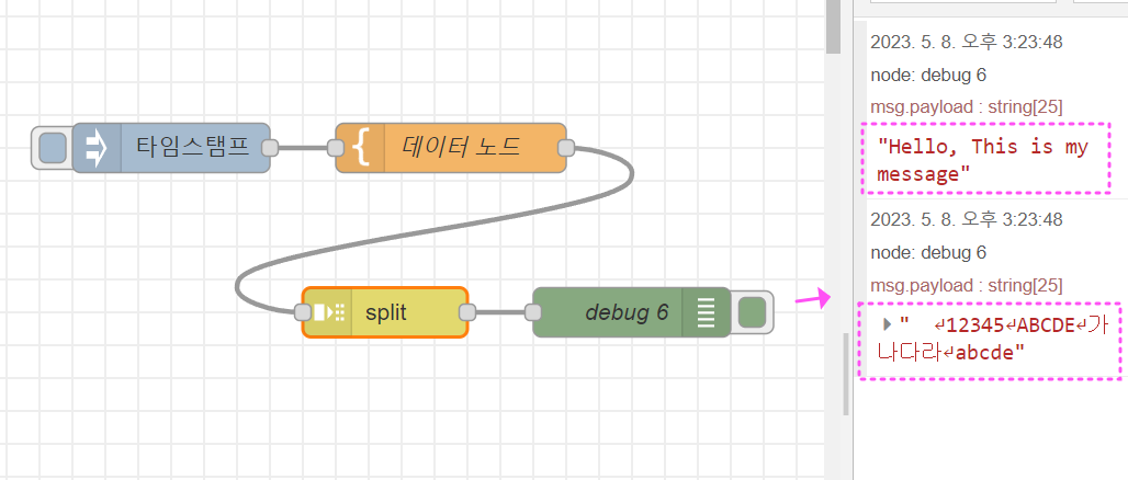 그럼, 예시로 split노드를 이용해서 전달할 메시지를 줄바뀜이 날 때마다 분리해 볼게요.