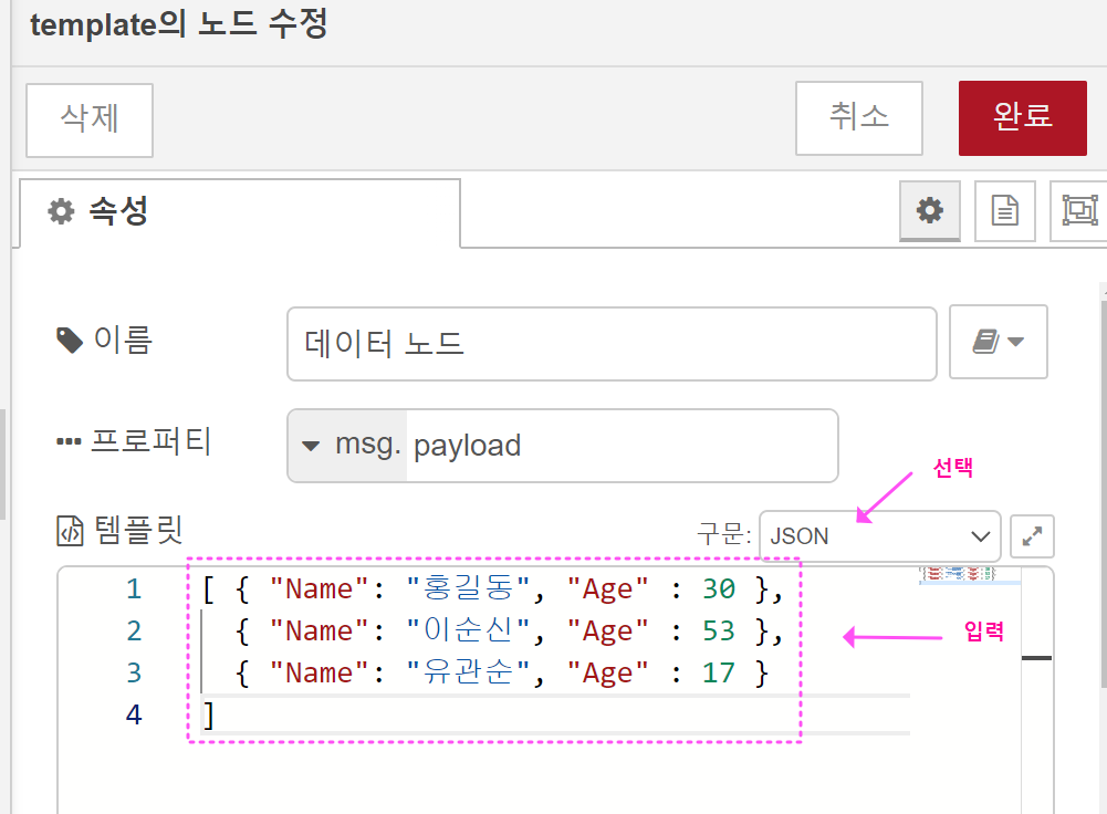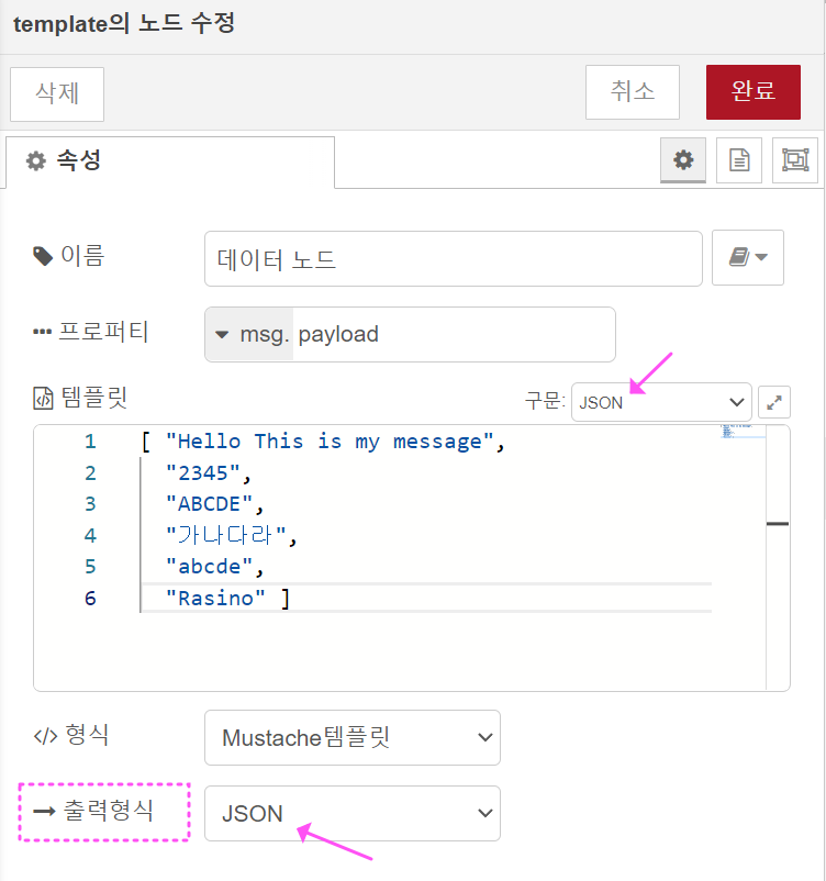 예시 ③) 배열 단위로 데이터를 분리(구분)할 수 있습니다. 템플릿 노드의 데이터와 속성을 아래처럼 수정해 주세요. ( 데이터를 배열형태로 바꾸고, 출력 형식을 'JSON'으로 변경합니다.)
