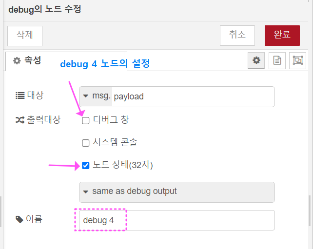 우선, 위와 같이 노드 플로우를 구성하고, Status의 설정과 디버그 1, 2, 3, 4의 설정은 아래와 같이 해주세요.