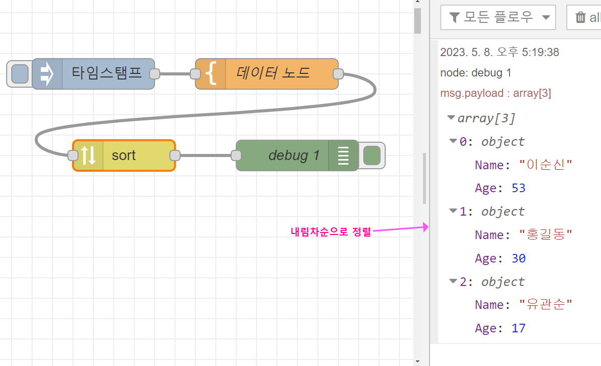 끝으로 Sort노드에서 내림차순으로 바꾸어 출력해 보면 아래처럼 잘 출력되는 것을 확인할 수 있습니다.