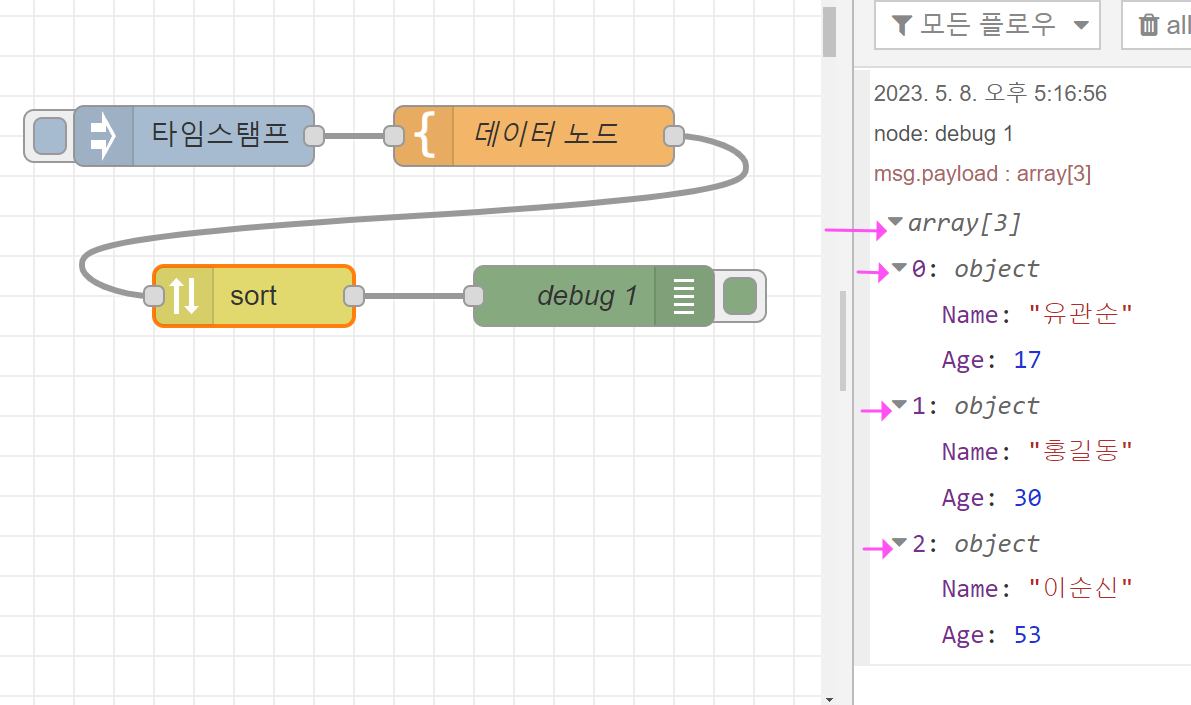 그리고 인젝트 버튼을 클릭하여 결과를 출력해보면 아래처럼 나이를 기준으로 오름차순으로 출력된 결과를 볼 수 있습니다. ( 데이터가 안 보일 경우 ▼array [3] 부분의 삼각형을 눌러 아래로 펼쳐보세요)