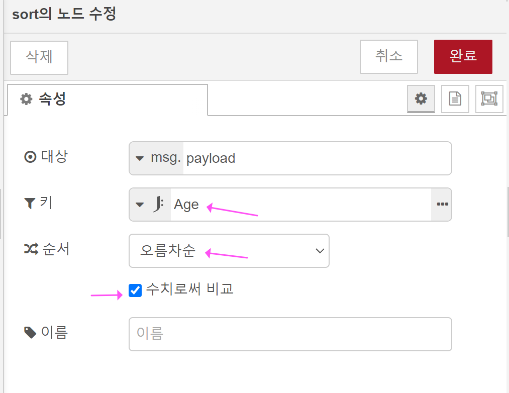 그리고, Sort노드는 아래처럼 수정해 주세요.
